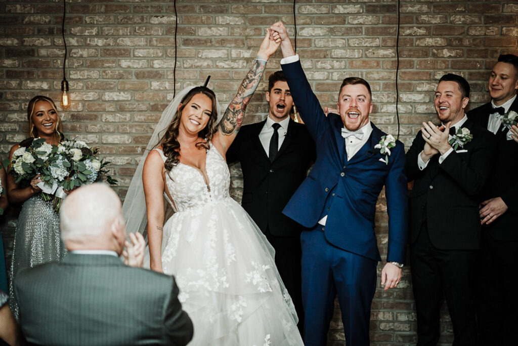 The ceremony space at 618 has this exposed brick wall that photographs beautifully, and when they were pronounced married, Collin’s reaction—arms thrown up in celebration—was pure joy. Their wedding party was right there celebrating with them.