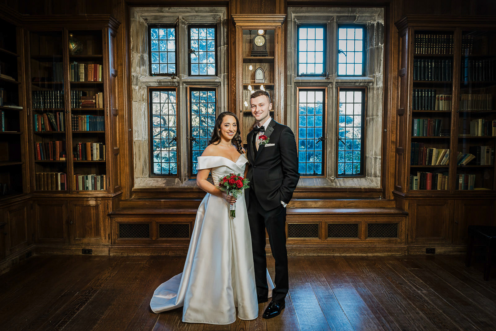 After the first look, we moved into the Library for family formals and bridal party shots. In winter, the Library tends to feel warmest and photographs beautifully because of the rich wood paneling.