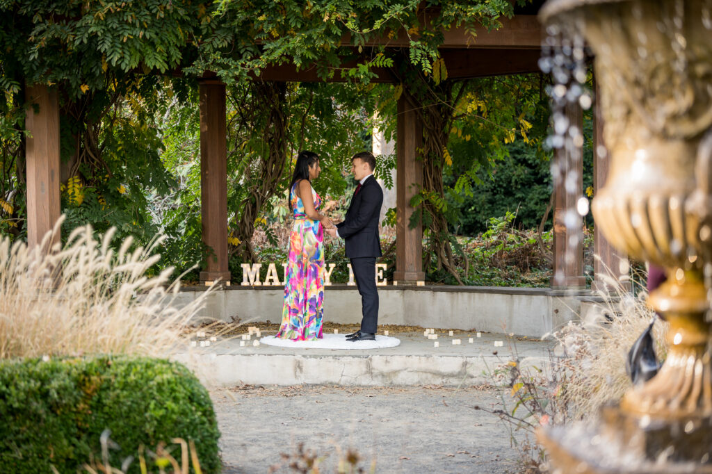 What I love about botanical garden proposals is the balance they offer. You get natural beauty with architectural structure. Privacy with variety. This couple chose their location thoughtfully—a secluded pergola that photographed beautifully from multiple angles.