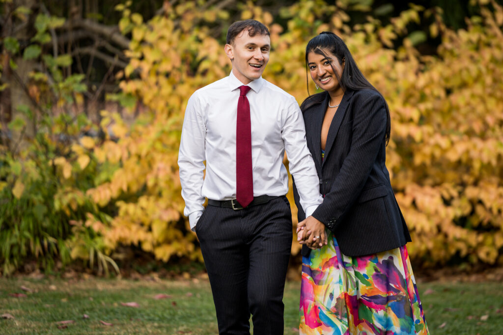 One major advantage of botanical garden proposal photography is variety. We moved from the formal pergola setting to areas with more natural fall foliage, creating different moods and color palettes throughout the session.