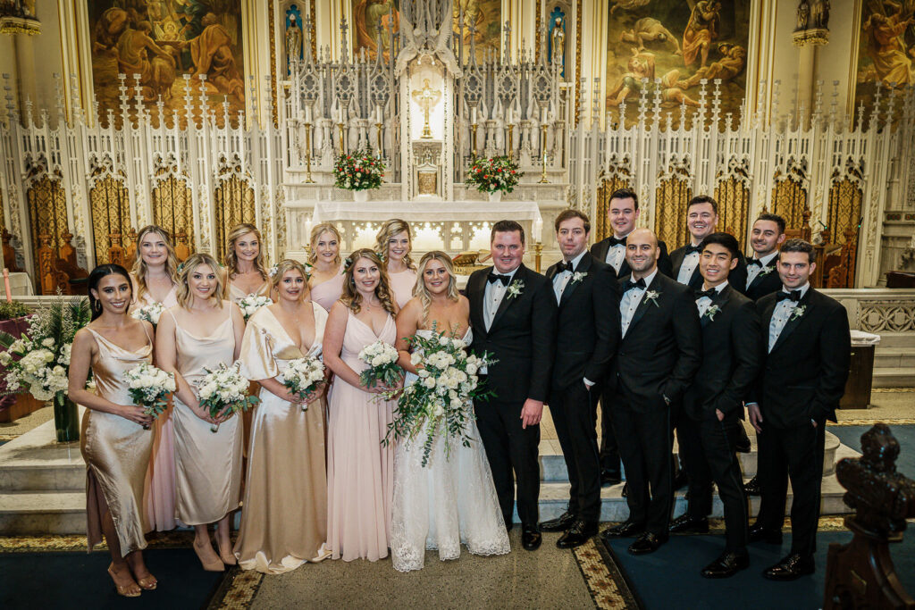 After the ceremony, we moved straight into family photos. Three generations on Kaitlyn’s side, close family on Daniel’s. We shot all combinations right there in the church before the trolley left for Midtown.