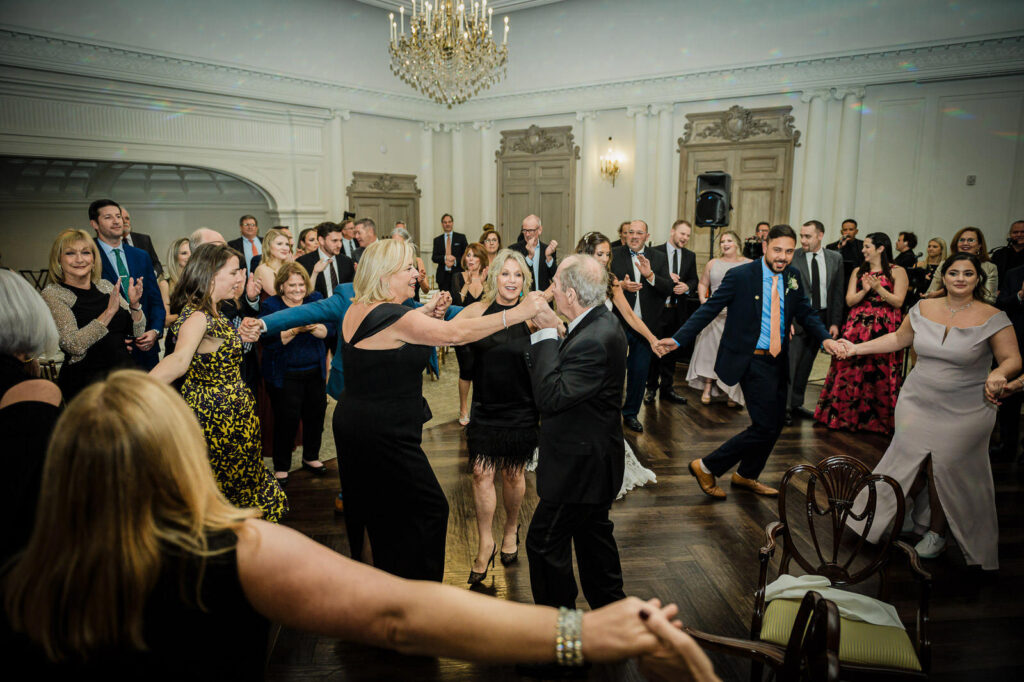 The energy during the hora was absolutely electric. Sammi and Mike were lifted up on chairs, napkins waving, everyone circling around them—this is the moment where you see a wedding transform from a formal event into a full-on celebration. The ballroom at Park Chateau can handle 130 guests easily with plenty of dance floor space, which you need when the hora gets going.