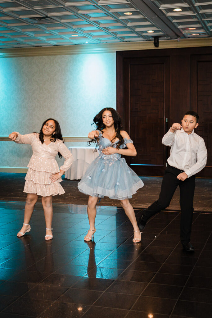 The sibling performance absolutely killed it. Ana Paulina in her party dress (yes, she changed into a shorter blue number for dancing) with her brother and sisters, all of them hitting their choreographed marks. Siblings who clearly practiced their routine, giving it everything they had on The Elan’s polished dance floor—this is what authentic celebration looks like.
