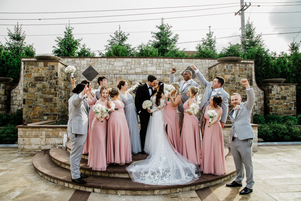 The bridal party brought the energy all day—from getting ready through the ceremony to this victorious celebration shot at the fountain. Six bridesmaids in blush, five groomsmen in grey, three ring bearers in black, and one flower girl who absolutely crushed it.
