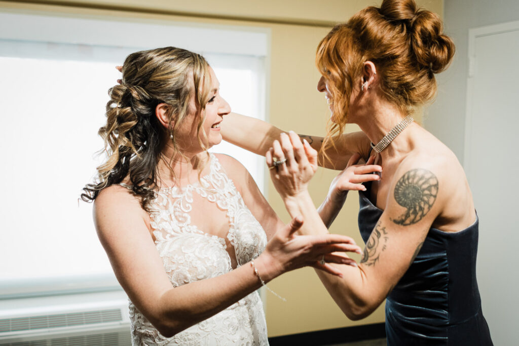 Bride celebrating with maid of honor before first look Windsor Ballroom