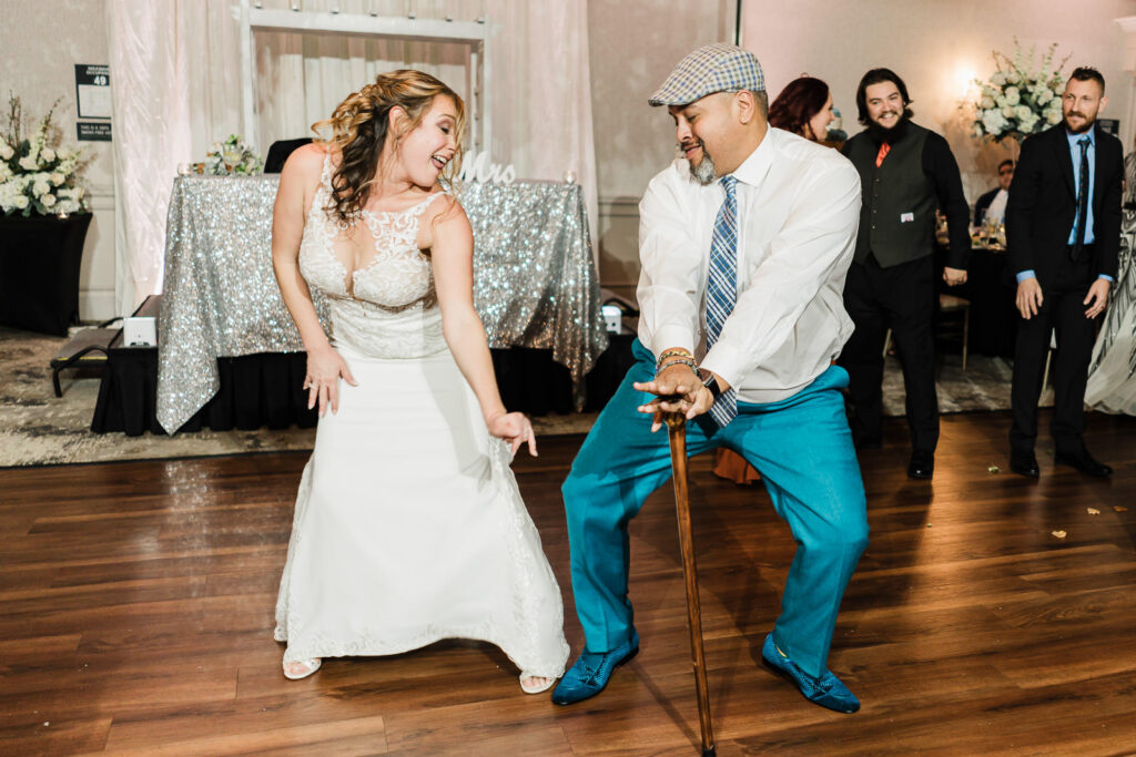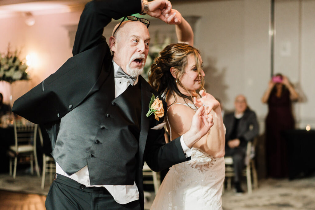 After cocktail hour, the reception kicked into high gear. Elyssa and Dennis’s first dance was intimate and beautiful—her veil flowing as they spun, completely lost in each other. Then came the parent dances, with Nate twirling his daughter around the dance floor with that same joy we’d seen during their first look hours earlier.